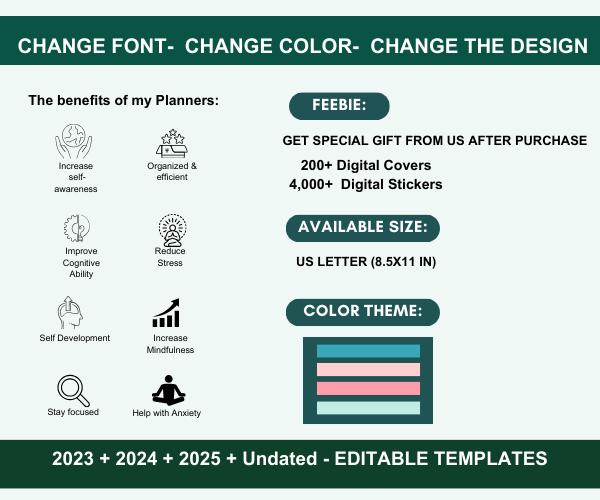 Introducing you the 185 Page Premium Digital Planner which is perfect purchase for you to stay organized, helping you find balance in your life, and you can embark on a transformative journey towards goal achievement effectively. It provides you with a structured way to manage your time, tasks, and aspirations. This innovative tool can seamlessly integrate into your daily routine, serving as your guide, motivator, and progress tracker. It provides a wide array of features, including customizable templates, reminders, collaborative options, and data analytics, making it the perfect companion on your journey towards realizing your dreams and your partner in journey to achievement.